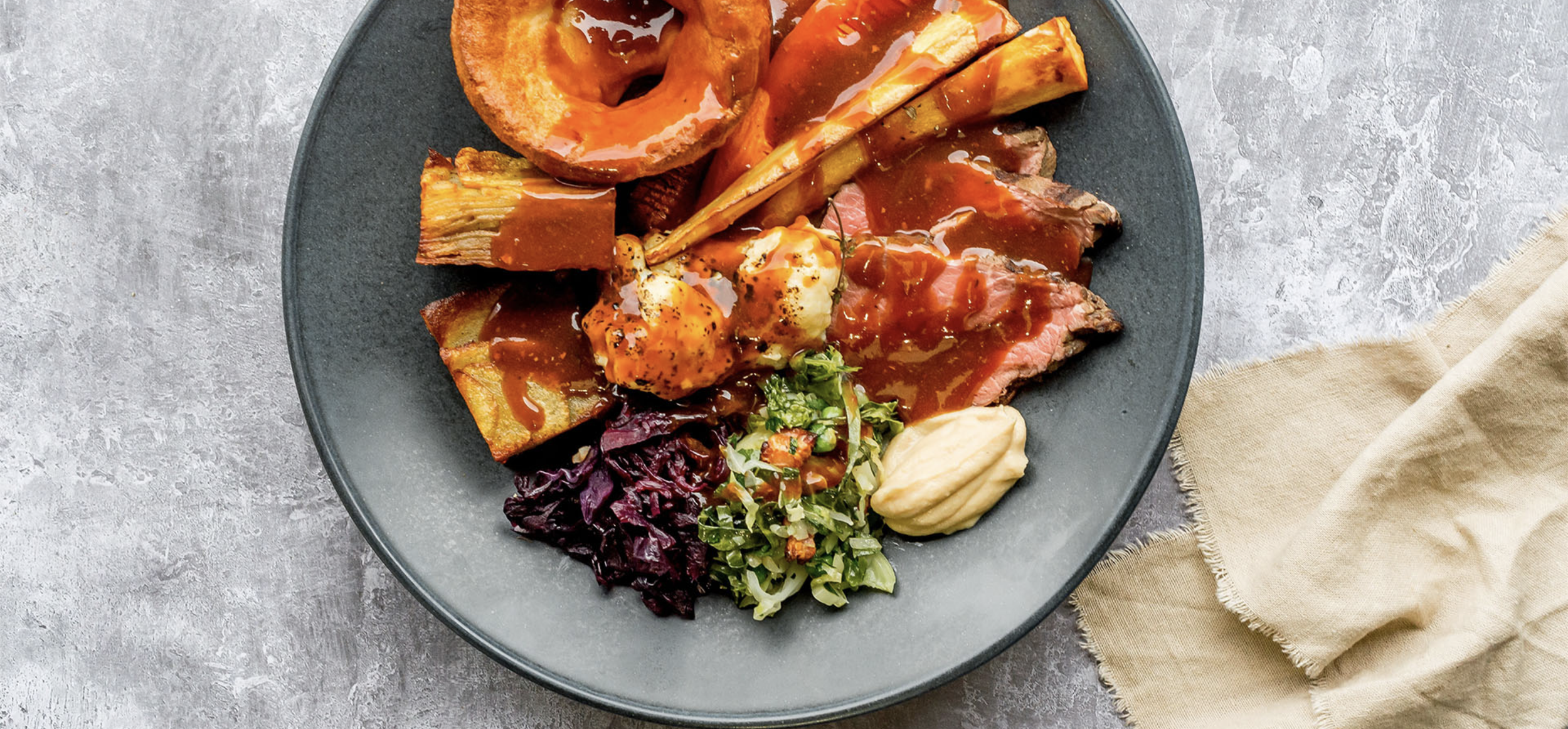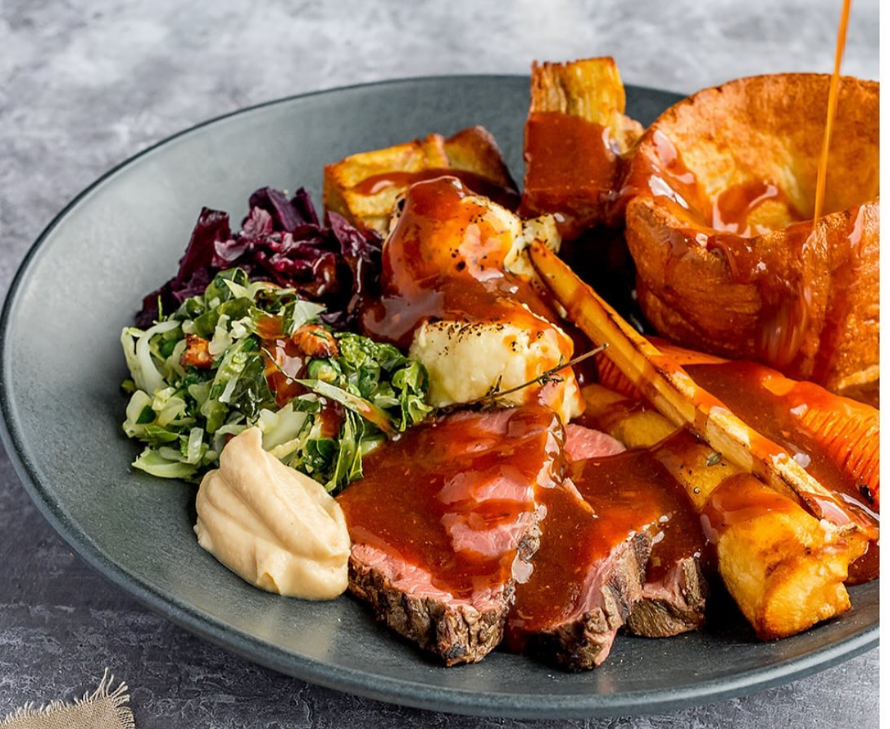 Roast potatoes, Mashed potatoes, Cauliflower cheese, Honey roasted carrots and parsnips, Braised sticky red cabbage, Yorkshire puddings, Rich Gravy
