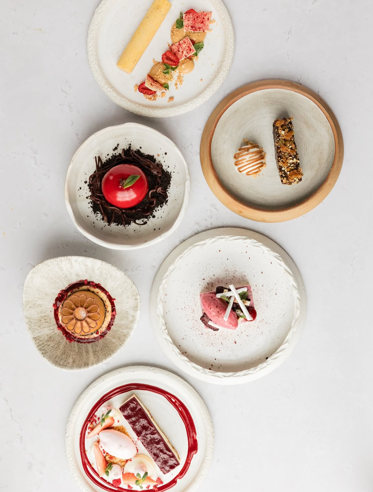 Classic set cheesecake with raspberry sorbet, fresh strawberry, fresh raspberry mini meringues, vanilla crème fraiche and micro basil